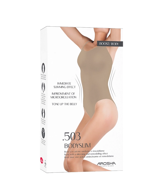 Arosha .503 BODYSLIM to zaawansowane technologicznie body, które modeluje, wyszczupla i ujędrnia ciało, zapewniając jednocześnie pełen komfort noszenia. Wykonane z inteligentnego materiału Dermofibra® z dodatkiem włókien Pure Resistex® Silver (99,9% srebra), aktywnie działa na skórę, pobudzając mikrokrążenie i wspomagając metabolizm.