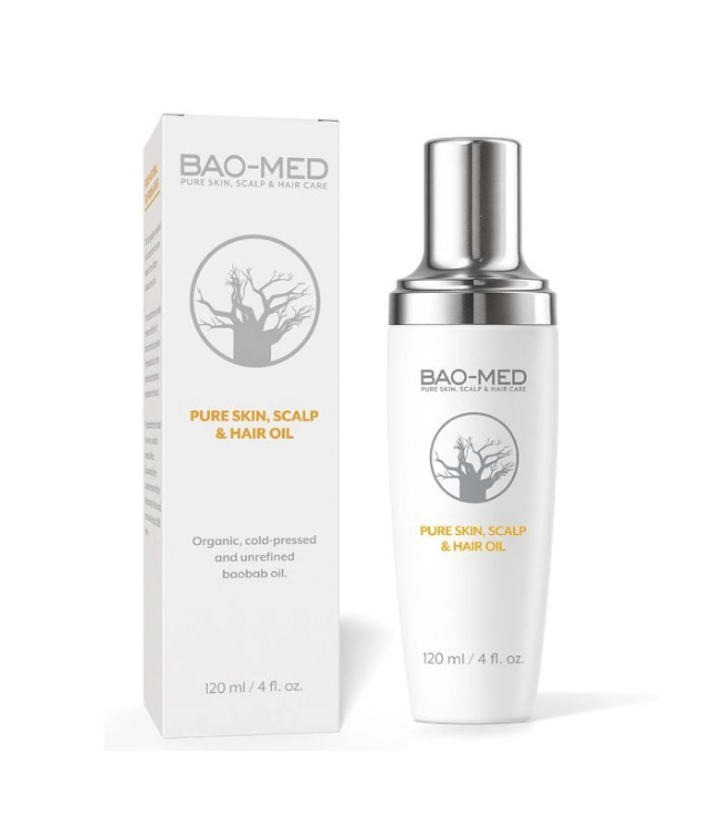 Bao-Med Czysty Olej Do Skóry, Skóry Głowy i Włosów to certyfikowany organiczny olej baobabu, tłoczony na zimno i nierafinowany. Ten ciepło złoty olej jest pozyskiwany z nasion afrykańskiego drzewa baobabu.