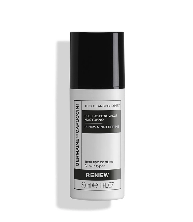 Germaine de Capuccini Cleansing Renew Night Peeling to zaawansowany nocny peeling, który łączy działanie chemiczne i enzymatyczne, zapewniając progresywną i ciągłą odnowę skóry podczas snu. Jego formuła oparta jest na połączeniu kwasów laktobionowego, fitowego i ferulowego oraz enzymów papainy, wzbogacona ekstraktem z kasztanowca o właściwościach pobudzających mikrokrążenie.