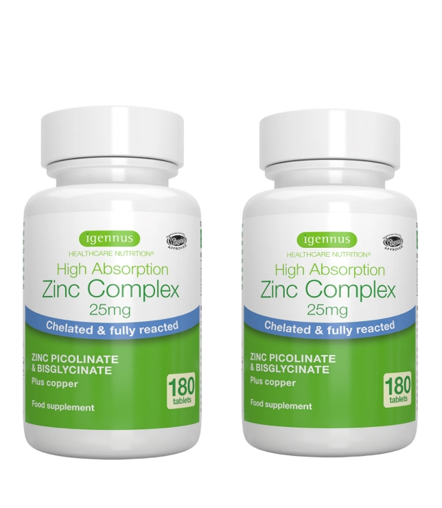 Zestaw dwóch opakowań Igennus Cynk Complex 25 mg to połączenie cynku i miedzi w wysoko przyswajalnych, chelatowanych formach (pikolinian i diglicynian), które wspierają prawidłowe funkcjonowanie organizmu, układ odpornościowy oraz kondycję skóry, włosów i paznokci. Dzięki wyjątkowej biodostępności suplement zwiększa poziom cynku w organizmie nawet o 40% skuteczniej niż tradycyjne preparaty.