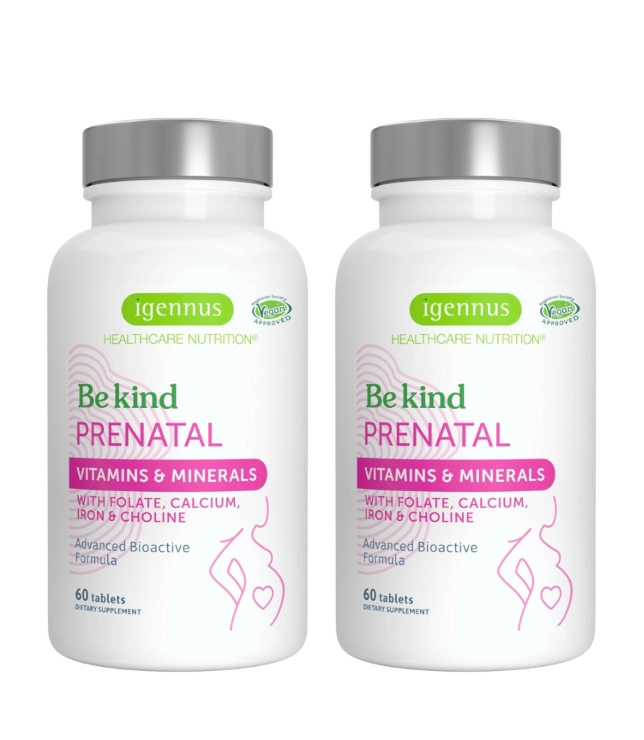 Zestaw dwóch opakowań Igennus Prenatal to kompleksowy suplement diety opracowany z myślą o kobietach w ciąży i karmiących piersią. Zawiera 22 bioaktywne składniki, w tym folian Quatrefolic®, cholinę, żelazo w formie diglicynianu, wapń z alg morskich Aquamin®, jod i witaminę D3 z alg.
