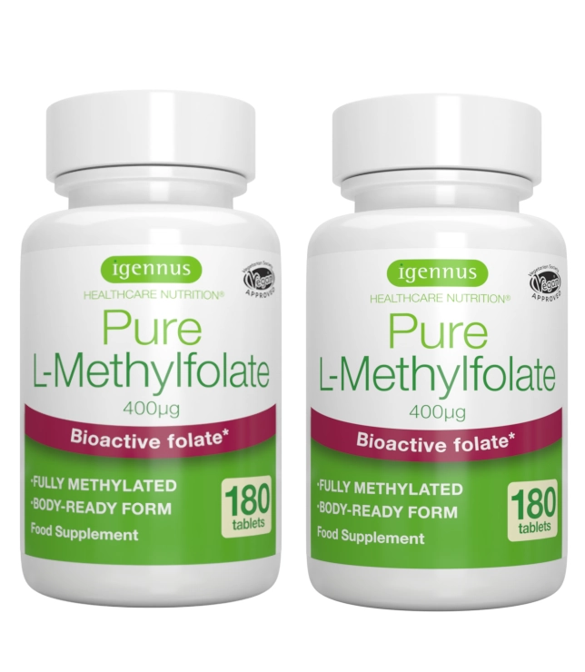 Zestaw dwóch opakowań Igennus Pure Methylfolate 400 µg to źródło aktywnego kwasu foliowego (5-MTHF) w czystej, dobrze przyswajalnej formie. Każde opakowanie zawiera 180 małych tabletek, bez zbędnych dodatków i alergenów.