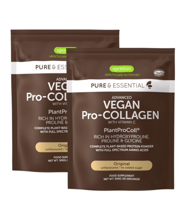 Kompleks PlantProColl™ z białek roślinnych (ryż, groch, dynia, słonecznik) zawiera kluczowe aminokwasy kolagenowe: glicynę, prolinę i hydroksyprolinę w optymalnym stosunku 2:1:1. Wzbogacony o witaminę C – niezbędną do syntezy kolagenu.