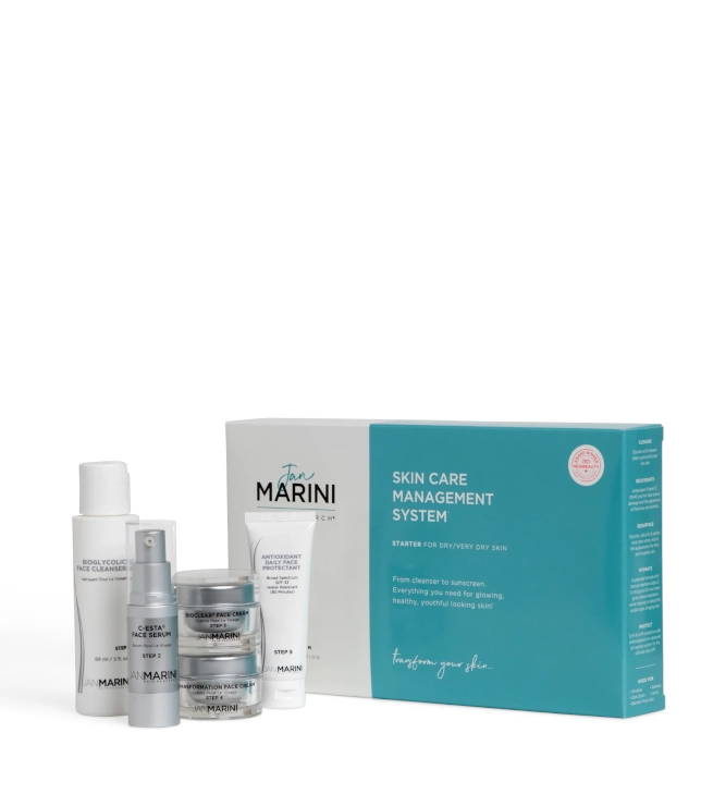 Jan Marini Skin Care Management System™ Starter to kompletny zestaw pielęgnacyjny opracowany z myślą o skórze suchej i bardzo suchej, potrzebującej intensywnej regeneracji, nawilżenia i wygładzenia. System łączy działanie kwasów, witamin, peptydów oraz antyoksydantów, zapewniając widoczne odmłodzenie już po kilku tygodniach stosowania.