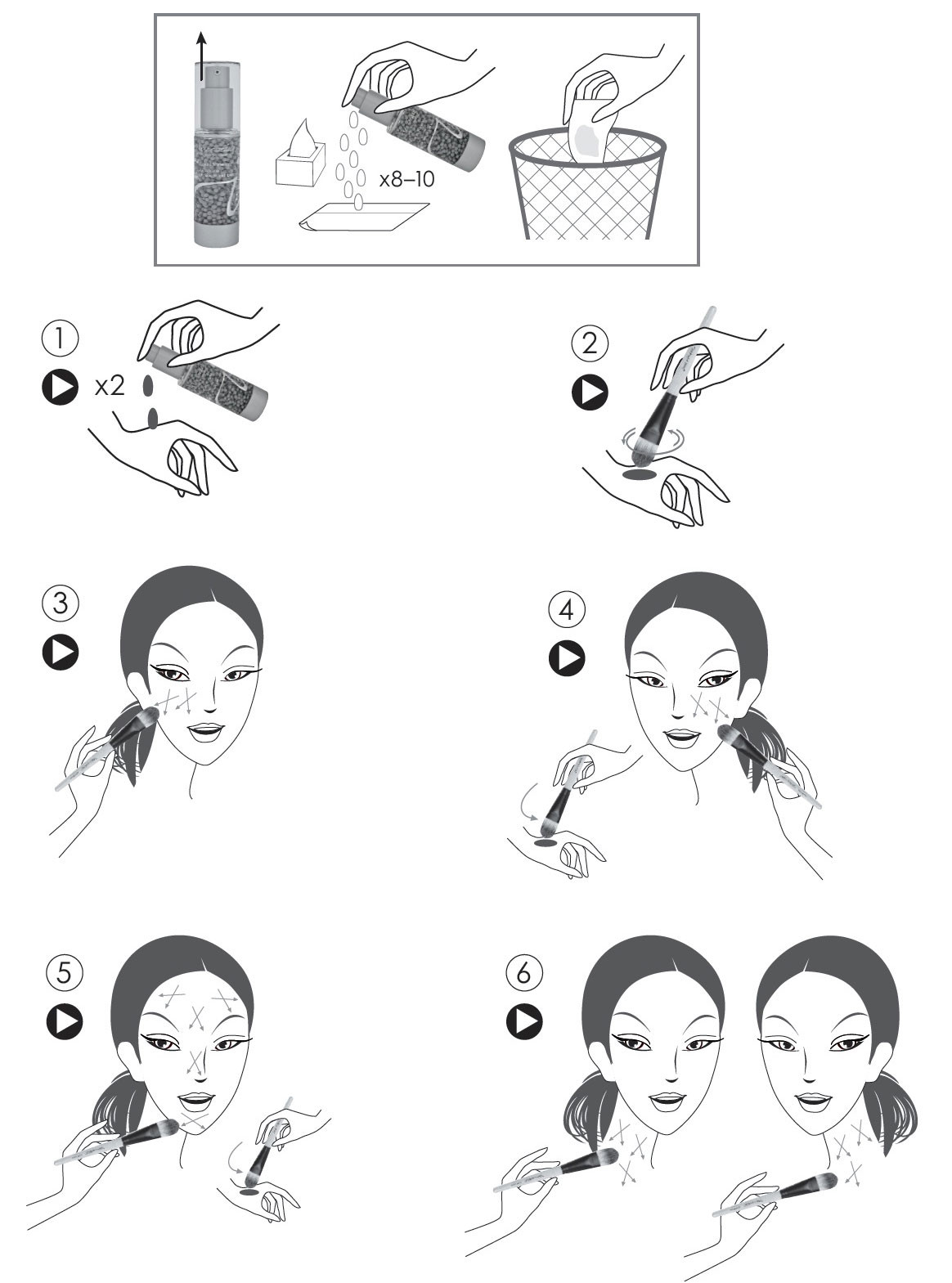 Użyć aplikatora dwukrotnie i ruchami krzyżowymi, stosując pędzelek Foundation, nałożyć nisko pod oczy, niżej na policzki, a następnie na czoło i centralną część twarzy. W celu wyrównania nierówności użyć gąbeczki Flocked Sponge, a następnie (jeśli jest taka potrzeba) nałożyć puder.