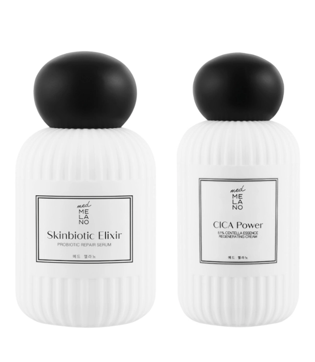 Zestaw Med Melano Skinbiotic Elixir – Probiotic Repair Serum oraz Cica Power! 51% Centella Essence Regenerating Cream to kompleksowa kuracja odbudowująca dla skóry wrażliwej, podrażnionej i osłabionej. Serum działa jak biomimetyczny opatrunek – wspiera mikrobiom, wzmacnia barierę hydrolipidową i przywraca cerze zdrowy, promienny wygląd. Skóra staje się wyraźnie gładsza, bardziej elastyczna i ukojona już po pierwszych aplikacjach.
