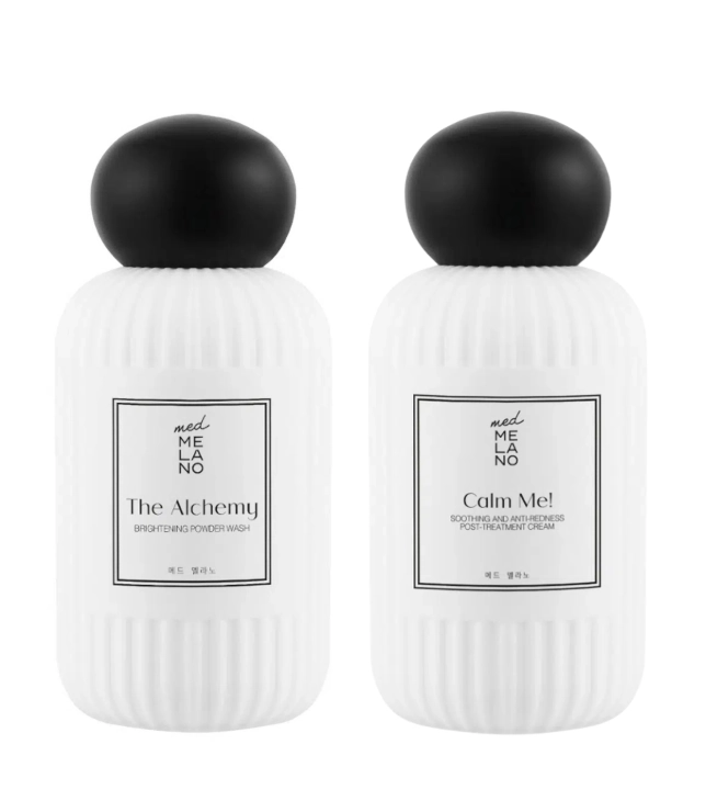 Zestaw Med Melano The Alchemy Brightening Powder Wash oraz Calm Me! Soothing And Anti-Redness Post-Treatment Cream to połączenie skutecznego, a jednocześnie delikatnego oczyszczania z intensywną regeneracją. Enzymatyczny puder w kontakcie z wodą zamienia się w jedwabistą pianę, która usuwa zanieczyszczenia i martwe komórki naskórka, przywracając cerze świeżość i naturalny blask.