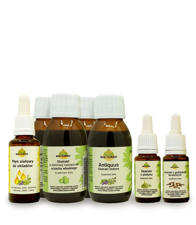 Zielone owoce orzecha (Juglandis recens fructus), ziele piołunu, ekstrakt ziołowy Antiquus 90 ml, woda, spirytus rektyfikowany (zawartość etanolu max 50% obj.), pączki kwiatów drzewa goździkowca korzennego, rozmaryn lekarski (Rosmarinus folium), lawenda lekarska (Lavandula flos), tymianek pospolity (Thymi herba), melisa lekarska, (Melissa folium), mięta pieprzowa, (Mentha piperita folium), pokrzywa zwyczajna (Urtica folium), bez czarny (Sambuci flos), płyn ziołowy do okładów 30 ml sporządzony na bazie oleju arganowego i ekstraktu z ziół. ekologicznych