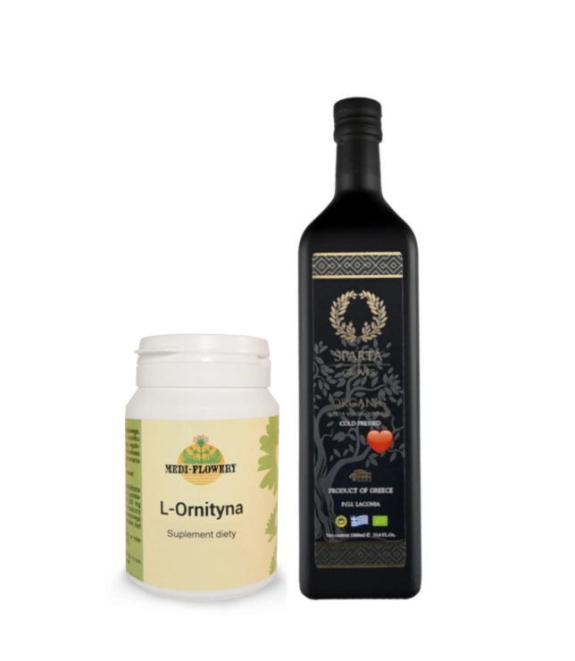 Zestaw nr 4 na wątrobę to proste, ale przemyślane połączenie suplementacji i codziennej diety. Łączy aminokwas L-ornitynę z wysokiej jakości oliwą z oliwek extra virgin, tworząc wygodny rytuał wspierający organizm każdego dnia.