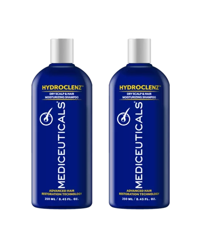 Zestaw 2x Mediceuticals Hydroclenz™ 250 ml – terapeutyczny, nawilżający szampon przeciw wypadaniu i przerzedzaniu włosów, stworzony z myślą o suchej skórze głowy. Idealny dla kobiet i mężczyzn zmagających się z łysieniem, osłabieniem i przesuszeniem włosów.