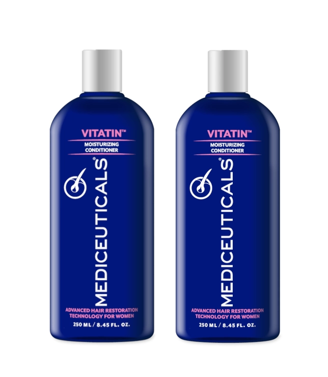 Zestaw 2x Mediceuticals Vitatin 250 ml – nawilżająca, lekkostrawna odżywka do włosów normalnych, suchych i zniszczonych, stworzona w ramach terapii Mediceuticals For Women. Produkt wzmacnia włosy od nasady, chroni je przed przerzedzaniem i wspomaga zdrowy wzrost włosów w efekcie zaburzeń hormonalnych.