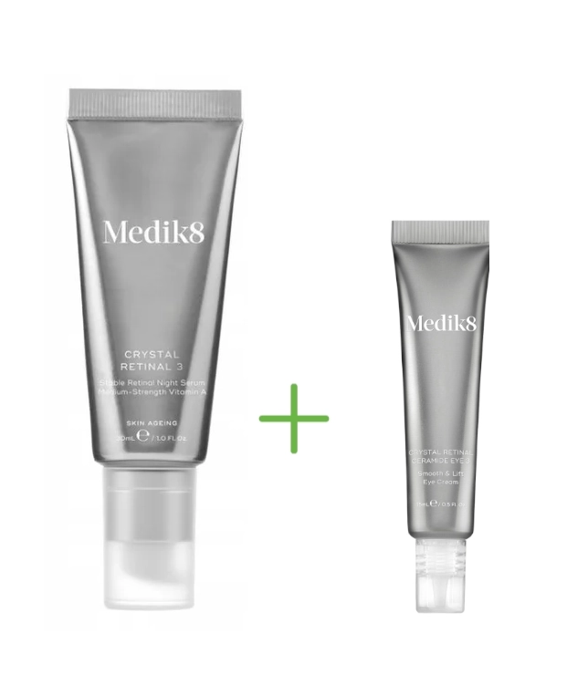 Medik8 Crystal Retinal Duo 3 – Twarz i Oczy to idealny zestaw startowy z retinalem, stworzony z myślą o kompleksowej pielęgnacji przeciwstarzeniowej skóry twarzy oraz delikatnej okolicy oczu.