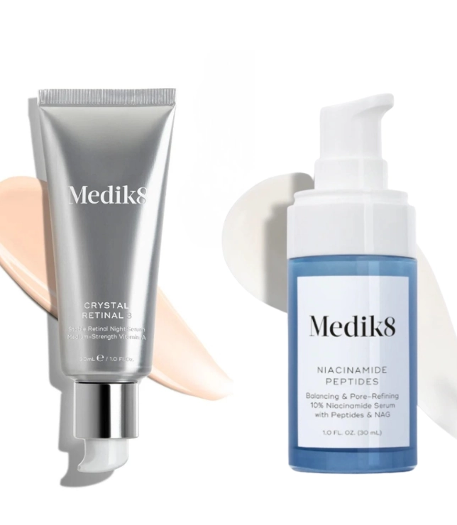 Zestaw Medik8 Crystal Retinal 3 + Niacinamide Peptides Serum to przemyślana, wieczorna i poranna rutyna pielęgnacyjna, która poprawia wygląd skóry krok po kroku. Cera zyskuje gładszą strukturę, zdrowszy koloryt i świeży, wypoczęty wygląd. Skóra wygląda na bardziej jednolitą, elastyczną i wyraźnie wzmocnioną.