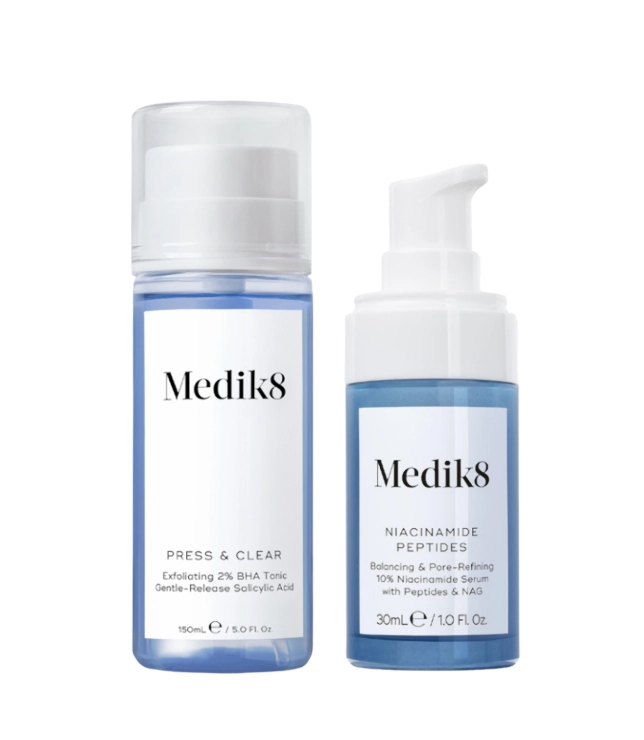 Zestaw Medik8 Press & Clear oraz Niacinamide Peptides Serum to skuteczne połączenie codziennego złuszczania i wzmacniającej pielęgnacji regulującej. Skóra staje się wyraźnie gładsza, bardziej jednolita i oczyszczona, a pory oraz niedoskonałości mniej widoczne już po kilku dniach regularnego stosowania.