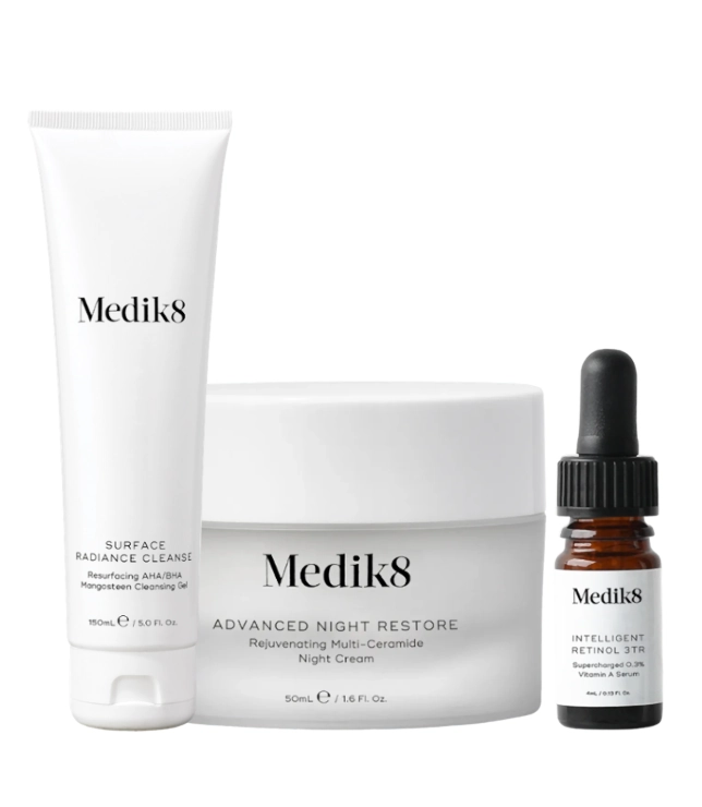 Zestaw Medik8 łączy skuteczne oczyszczanie, nocną regenerację oraz działanie retinolu w pielęgnacji przeciwstarzeniowej. Połączenie żelu złuszczającego Surface Radiance Cleanse z odżywczym kremem Advanced Night Restore sprawia, że skóra staje się wyraźnie gładsza, bardziej promienna i pełna świeżości.