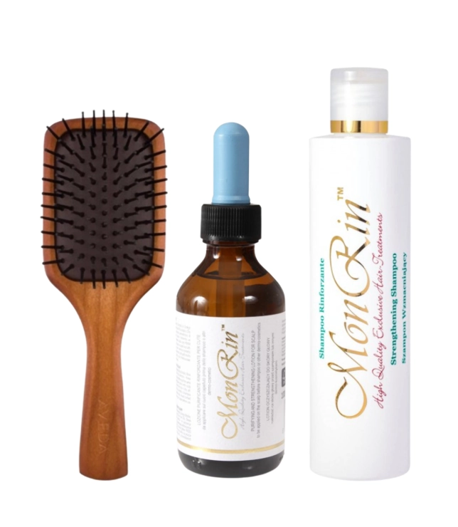 Zestaw Monrin z lotionem oczyszczająco-wzmacniającym 100 ml, szamponem wzmacniającym oraz szczotką Aveda to kompleksowa pielęgnacja, która przywraca skórze głowy równowagę, a włosom lekkość i siłę. Już po pierwszych zastosowaniach skóra głowy staje się odświeżona, a włosy wyraźnie uniesione u nasady, bardziej sprężyste i pełne naturalnego blasku.