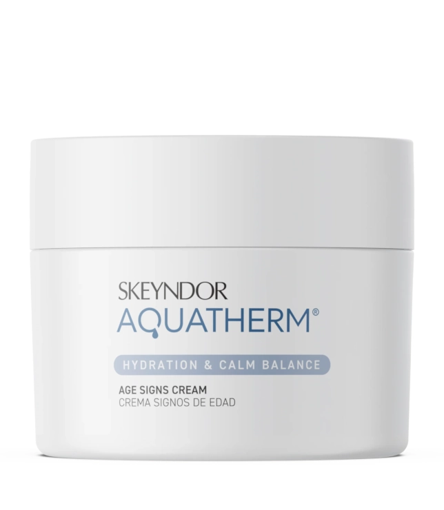 Skeyndor AQUATHERM Age Signs Cream to przeciwzmarszczkowy krem emolientowy stworzony z myślą o delikatnej, wrażliwej i reaktywnej skórze dojrzałej oraz z pierwszymi oznakami starzenia. Zapewnia długotrwałe nawilżenie, ukojenie i wyraźny komfort, jednocześnie chroniąc skórę przed czynnikami przyspieszającymi procesy starzenia.