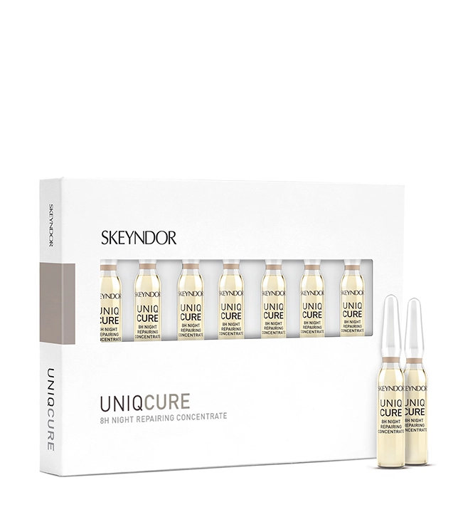 Skeyndor UNIQCURE 8h Night Repairing Concentrate to intensywna, 7-dniowa nocna kuracja regenerująca, która przywraca skórze energię, świeżość i zdrowy wygląd. Rano cera wygląda na wyraźnie bardziej wypoczętą, napiętą i odżywioną, a oznaki zmęczenia i stresu stają się mniej widoczne.