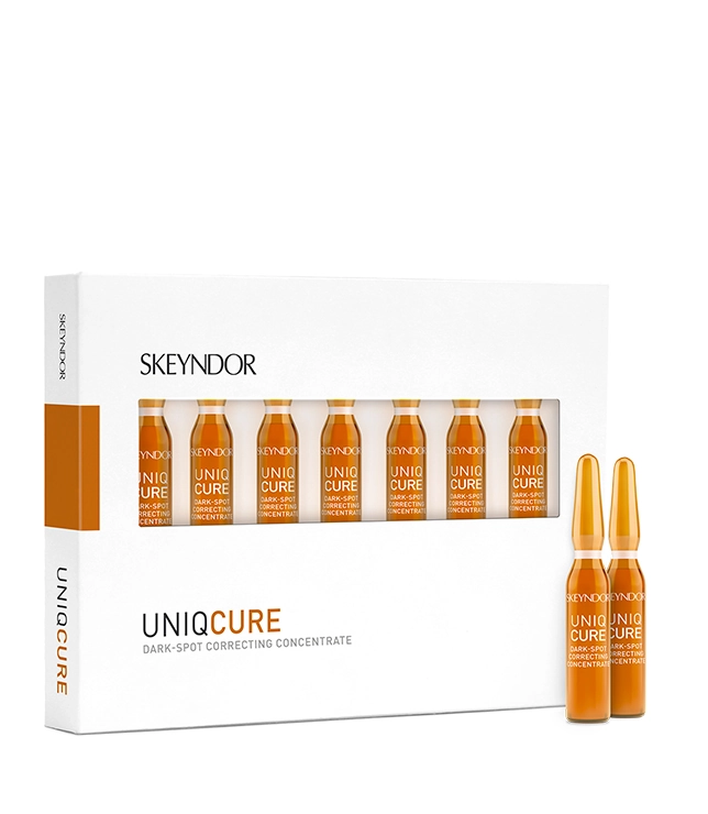 Skeyndor UNIQCURE Dark Spot Correcting Concentrate to 7-dniowa kuracja rozjaśniająca, która skutecznie poprawia koloryt skóry i redukuje widoczność przebarwień. Skóra stopniowo odzyskuje jednolity, świeży wygląd, a jej odcień staje się jaśniejszy i bardziej promienny.
