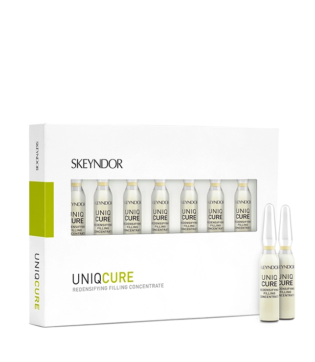 Skeyndor UNIQCURE Redensifying Filling Concentrate to 7-dniowa kuracja ujędrniająca, która przywraca skórze gęstość, sprężystość i wyraźnie poprawia owal twarzy. Skóra wygląda na bardziej napiętą, wypełnioną i wygładzoną, a zmarszczki – szczególnie w okolicy bruzd nosowo-wargowych – stają się mniej widoczne.