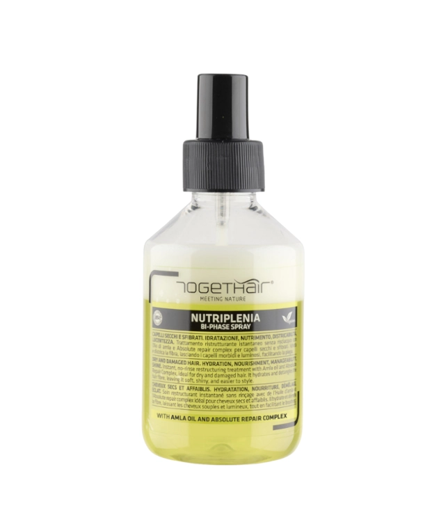 Togethair Nutriplenia Biphase to dwufazowy, natychmiast działający spray odbudowujący, stworzony dla włosów suchych, zniszczonych i odwodnionych. Jest to intensywna kuracja bez spłukiwania, która jednocześnie nawilża, regeneruje i ułatwia rozczesywanie włókna włosa, pozostawiając włosy miękkie, elastyczne i pełne blasku.