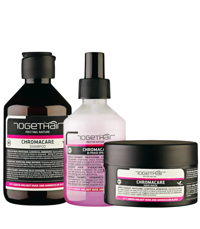 Togethair Chromacare to idealny prezent dla osób, które chcą cieszyć się intensywnym, lśniącym i trwałym kolorem przez wiele tygodni po koloryzacji. Kompletny zestaw pielęgnacyjny – to gotowy upominek, który wzmacnia, wygładza i chroni włosy farbowane oraz rozjaśniane. Regularne stosowanie produktów z linii Chromacare pomaga zatrzymać pigment wewnątrz włókna i zmniejszyć blaknięcie, jednocześnie dbając o miękkość i zdrowy wygląd włosów.