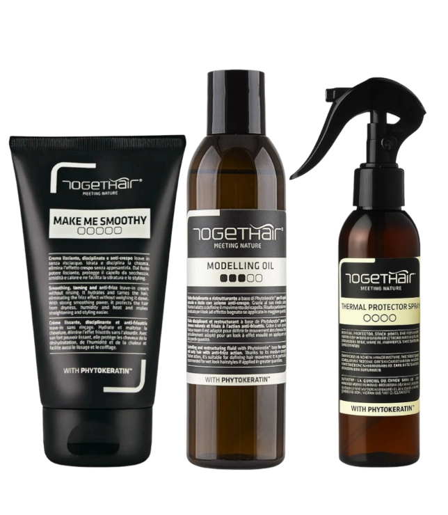 Zestaw ten, to kompletna pielęgnacja wygładzająca dla włosów, które tracą kontrolę, puszą się i reagują na wilgoć. Połączenie kremu Make Me Smoothy, olejku Modelling Oil oraz ochrony termicznej sprawia, że włosy stają się jedwabiście miękkie, zdyscyplinowane i odporne na puszenie. To szybki sposób na efekt gładkiej tafli, który utrzymuje się przez cały dzień.